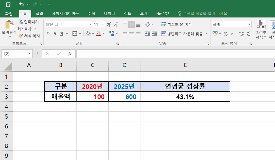 예제) 2020년 매출 100만원이었던 회사는 2025년에 매출 600만원을 달성하기 위해서는 연평균 성장률이 몇%인가?
