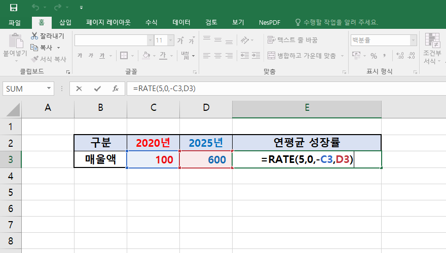 CAGR 공식은 사용하기 복잡하게 되어 있기때문에 엑셀에서는 손쉽게 RATE 함수를 이용하면 편리하게 성장률을 구할 수 있습니다.